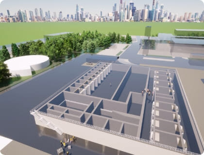 浄水・下水処理の巨大な水処理施設は防災上、震災時に機能を停止してはならないという極めて厳しい耐震設計要求を受けています。これら大規模複合構造物の構造設計で業界トップクラスの設計実績を有してます。手がけた水処理施設は日本全国各地で、私たちの日常生活を支えています。
