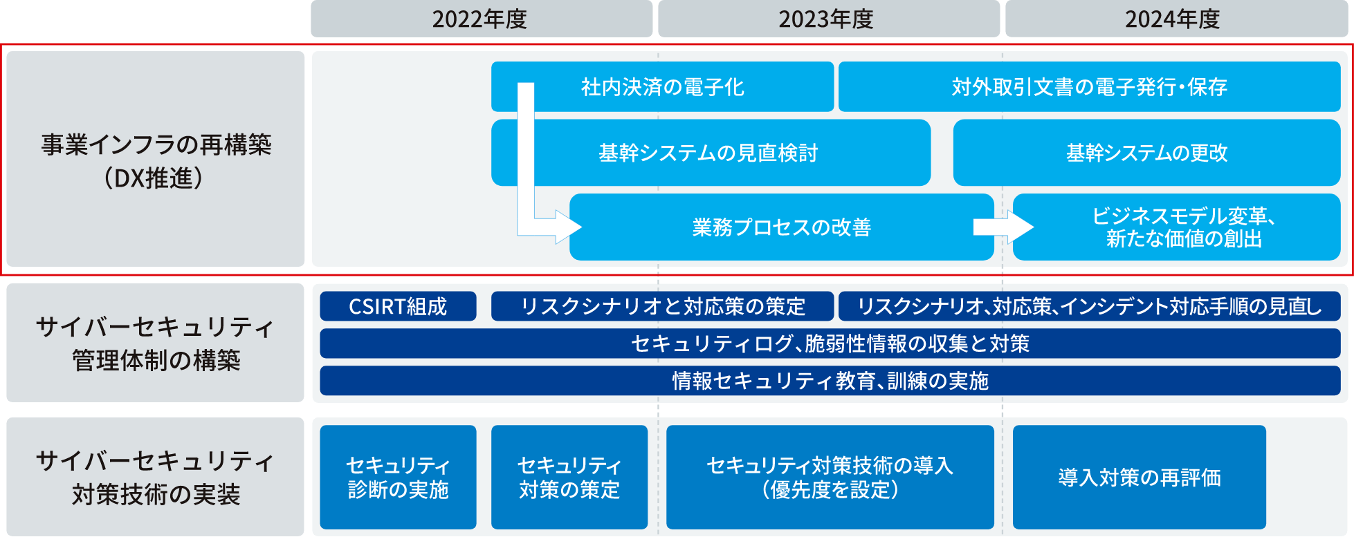 サイバー攻撃は年々高度化・複雑化しています。当社の企業活動において、事業継続や個人情報保護の観点から、これらサイバー攻撃の脅威に備えることは極めて重要と考えています。また、当社グループは様々な業界のサプライチェーンを担っており、サプライチェーン全体でサイバーセキュリティ対策に取り組んでいく必要があります。これら背景を踏まえ、当社は、中期経営計画「Challenge 2024」に基づく戦略「事業インフラの再構築」として、高度化・複雑化するサイバー攻撃の増加に備えたグループサイバーセキュリティ態勢をさらに強化させていくことを目指しています。
