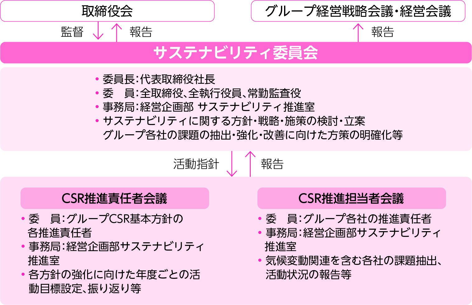 本委員会において、サステナビリティに関する方針・戦略・計画・施策の検討・立案、グループ各社の課題の抽出と強化・改善に向けた方策の明確化等の審議を行っています。事務局は経営企画部サステナビリティ推進室が担い、審議された内容は適宜グループ経営戦略会議・経営会議・取締役会に報告されます。そのほか、ガバナンス委員会、コンプライアンス委員会、グループリスクマネジメント委員会等によりサステナビリティ推進の強化を図っています。